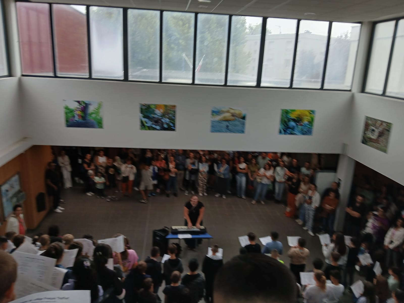 A la fin de la journée, les familles, les professeurs principaux, les chefs d'établissement, les membres de la communauté éducative ont été invités dans le hall du collège pour écouter et applaudir les 7 classes de 6èmes qui ont interprété ces deux chansons en choeur.
